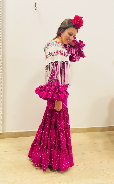 Traje de flamenca bugambilla con lunarios blancos.
