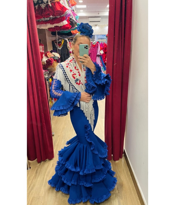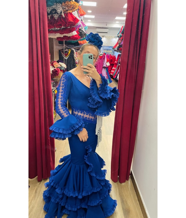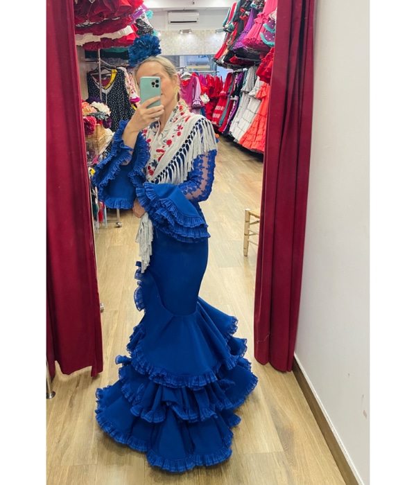 Traje de flamenca confeccionado en tejido elástico biscoelástico en azulón.
